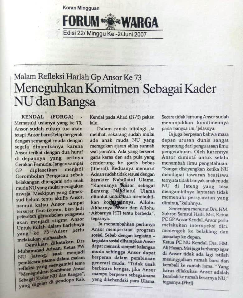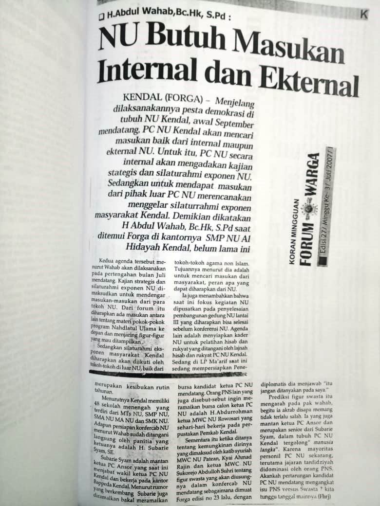 Oleh: Fahroji Menjelang Konferensi Cabang (Konfercab) Nahdlatul Ulama Kabupaten Kendal 2007 di Boja, PC NU Kendal menggelar beberapa kegiatan...